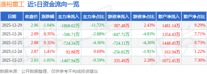12月29日的资金流向数据方面,主力资金净流出1868.62万元,占总成交额11.72%,游资资金净流入387.48万元,占总成交额2.43%,散户资金净流入1481.14万元,占总成交额9.29%。