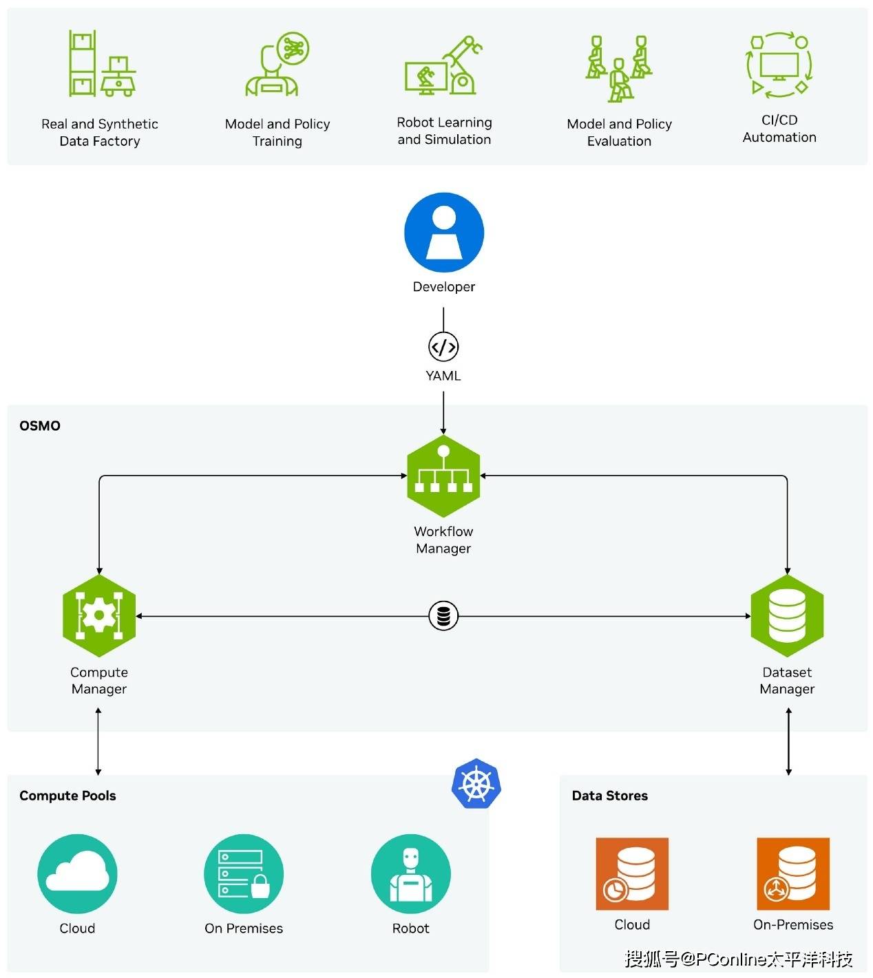 另一款框架OSMO则聚焦“全流程整合”——作为云原生编排工具,它能将机器人开发的各个环节(合成数据生成、模型训练、软件测试)整合到一个“命令中心”,支持开发者跨计算环境操作,无论是本地工作站还是混合云实例,都能高效协同。目前,Hexagon Robotics等企业已开始使用OSMO,微软也将其集成到Azure Robotics Accelerator工具链中,进一步扩大生态覆盖。