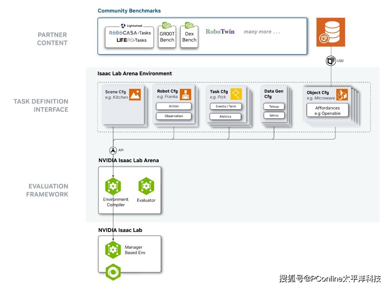 模型之外,开发框架的升级同样关键。针对机器人训练“工作流分散、难以管理”的问题,NVIDIA在GitHub发布了Isaac Lab-Arena开源框架——这是一个专为大规模机器人策略评估与基准测试设计的协作系统,不仅能对接Libero、Robocasa等业界主流基准测试体系,还能通过标准化测试流程,确保机器人技能在落地前具备稳健性。比如开发者训练一款搬运机器人后,可通过Isaac Lab-Arena模拟不同地面材质、货物重量的场景,验证机器人是否能稳定工作,避免“虚拟训练优秀、现实落地失效”的问题。